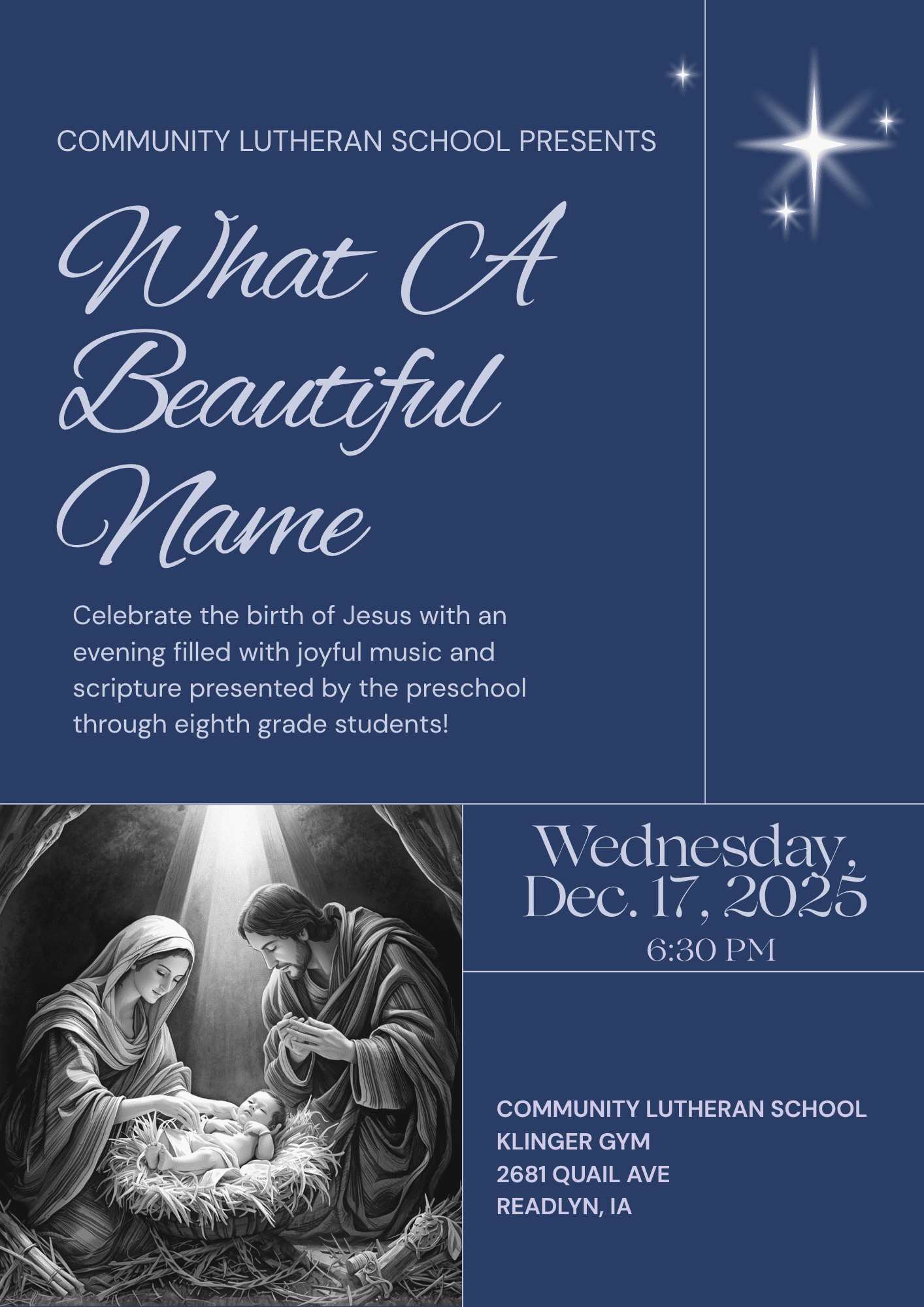- Wednesday, December 17: Christmas Musical “What a Beautiful Name” 6:30pm at the Klinger campus